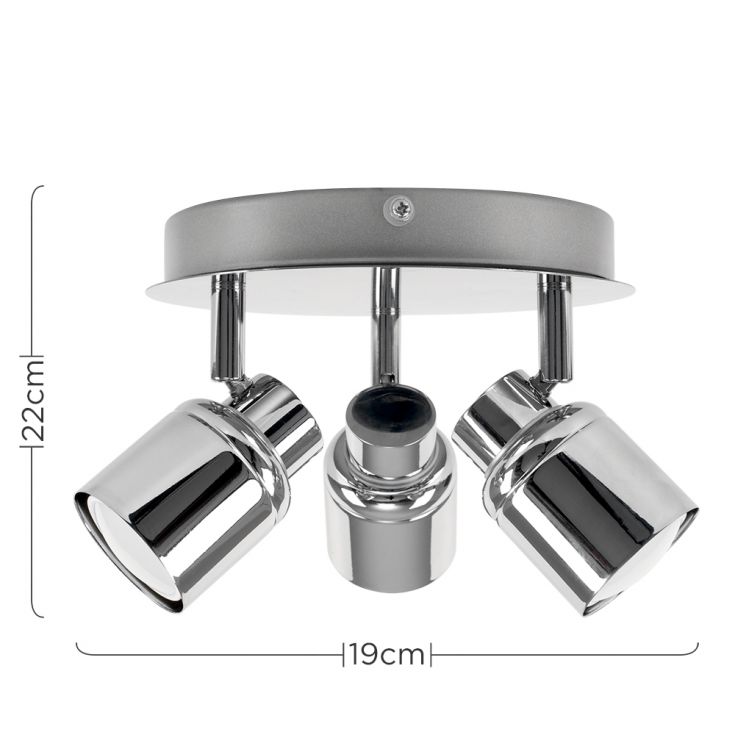 Sparkle up your home with a glimmer of light with our 3 way round ceiling spotlights. With our adjustable spot light heads you can easily move these lights around to personalise your home lighting, whether you can to illuminate different thing or put all emphasis on one thing, these are perfect for any of your lighting needs. Painted and polished in a metallic silver helps bring your home that sleek look and luxurious feeling. Crafted from high-quality and durable metal to ensure you have stress free lighting.