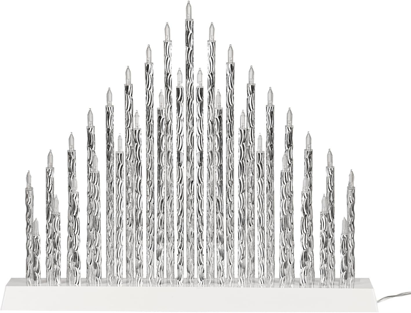 Christmas 33 Warm White LED Pipe Twisted Candle Bridge A contemporary take on the classic candle bridge, featuring twisted silver faux candles and warm white LED lighting that creates an inviting glow. The durable plastic construction suits any décor style, whether displayed on a windowsill, shelf, mantelpiece, or dining table. Battery-operated for convenient placement anywhere in your home—no wiring required. Perfect for adding festive warmth to living spaces or gifting to someone special this season.