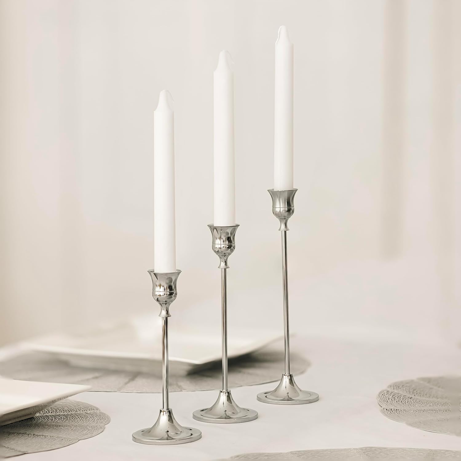 3 Pack Silver Candlestick Holders with Unscented Taper Candle