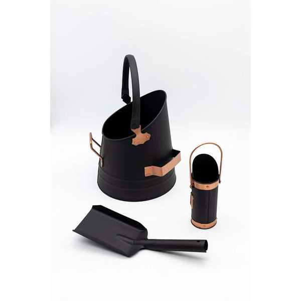 Black and Bronze Coal bucket, shovel and match canister Size of Coal Bucket - 39cm x 25cm x 25cm Size of Coal Shovel - 33cm x 12cm x 2cm Size of Match Canister - 19cm x 6.5cm x 6.5cm (Approximate) Does not include matches Colour - Black and Bronze