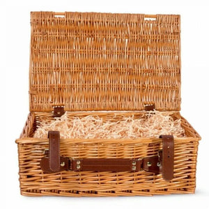 Includes: Basket with leather handle and lid, 2 colours of ribbon, shredded paper & cellophane.