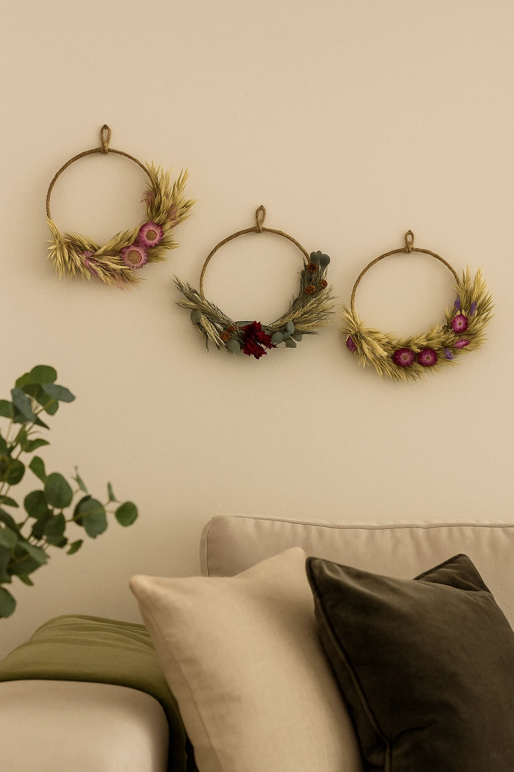 Bring warmth and natural beauty into your home with our 3-piece set of Hanging Dried Flower Wreaths. Featuring three distinct styles, you can display them together for a harmonious look or place them individually to enhance various rooms. Their lightweight design makes them simple to hang, adding a charming touch to any modern, rustic, or country-inspired decor.