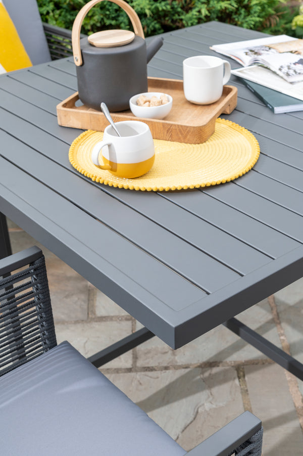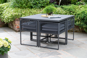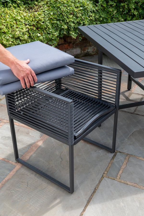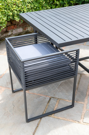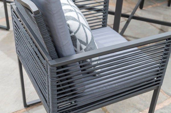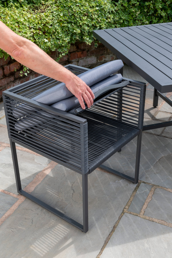 The Sheringham Set features a lightweight yet durable aluminium frame, ideal for easy movement and year-round outdoor use. Its PVC Textilene rope adds a stylish touch, paired with light showerproof polyester cushions in matching anthracite. The clever cube design allows all four chairs to tuck neatly under the table, creating a sleek, space-saving solution with a modern dark slate grey finish.