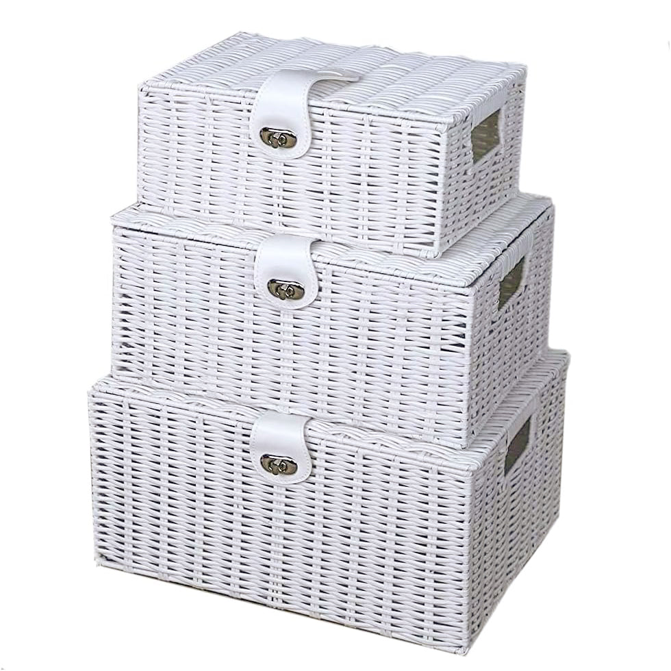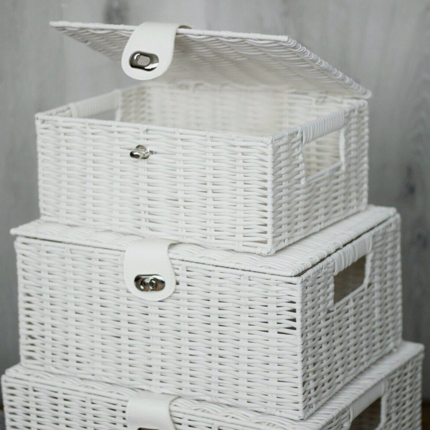 Our White wicker basket is made from a handwoven resin material on a metal wire frame which makes them durable, strong, stable, and gives you long-lasting service. They will look great anywhere around the home or office. This woven style wicker storage basket with lid and leather-look strap lock with an insert handle nesting for convenient storage.