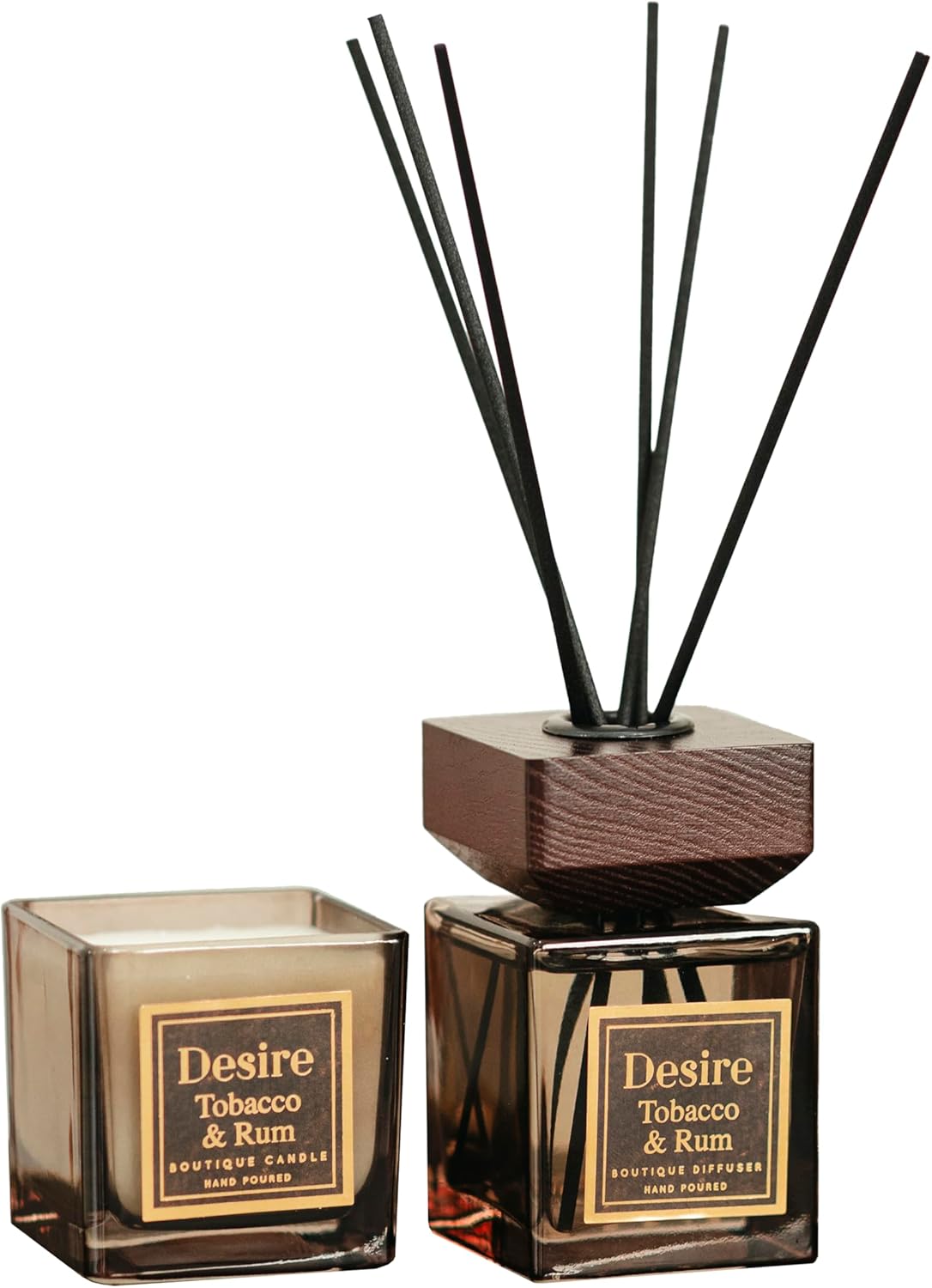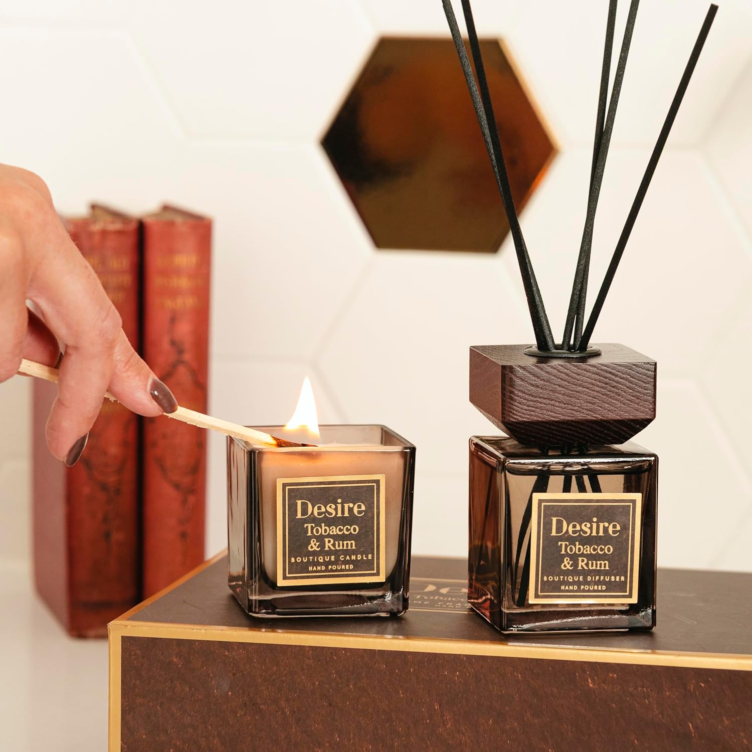 150ml reed diffuser and 100g candle set in stylish ribbed glass. The diffuser lasts up to 6 weeks while the candle burns for approximately 18 hours. Featuring a warm Tobacco & Rum fragrance with smoky, spiced notes, this set brings cosy sophistication to any room. Perfect for bedrooms, bathrooms, or living spaces, it combines premium quality with everyday elegance.