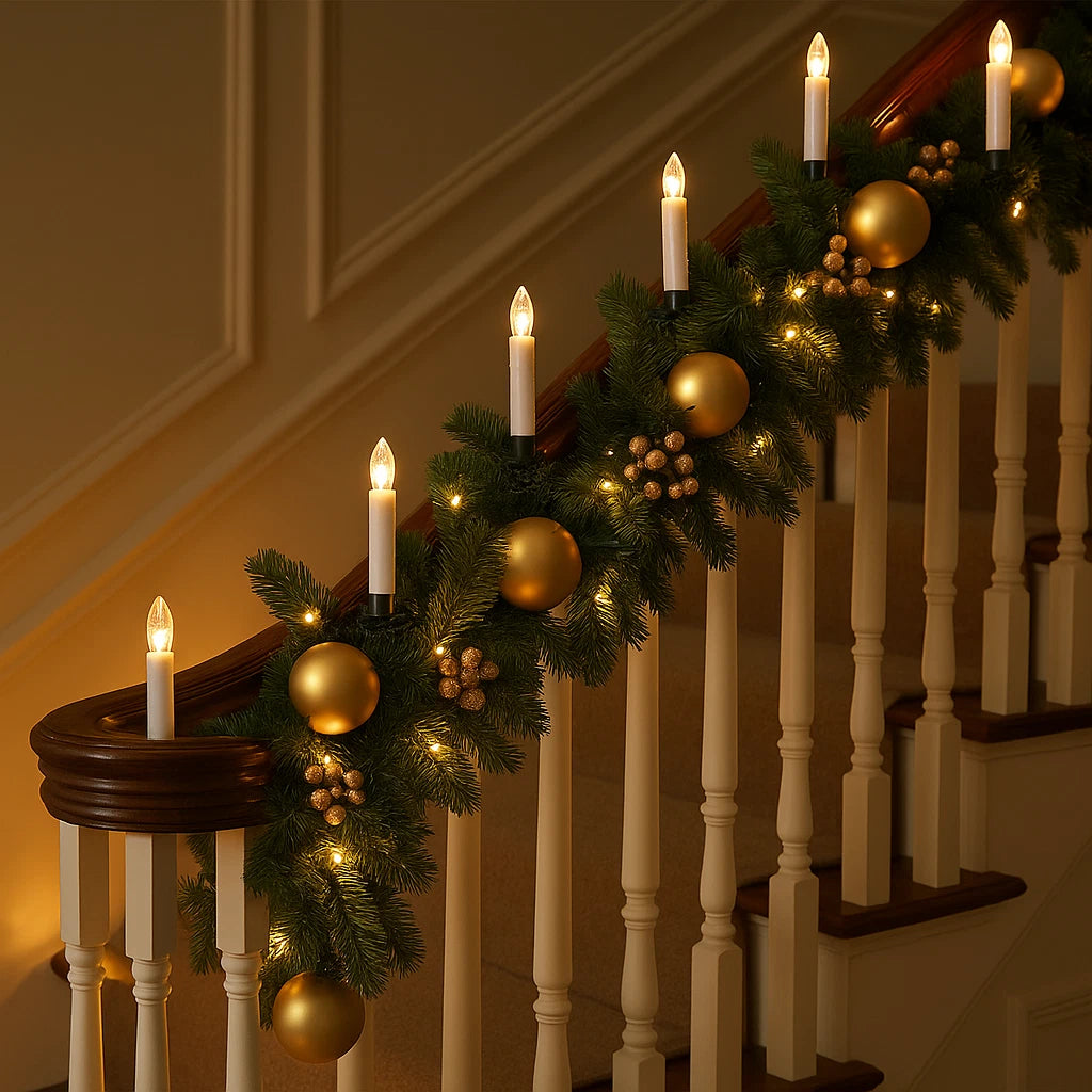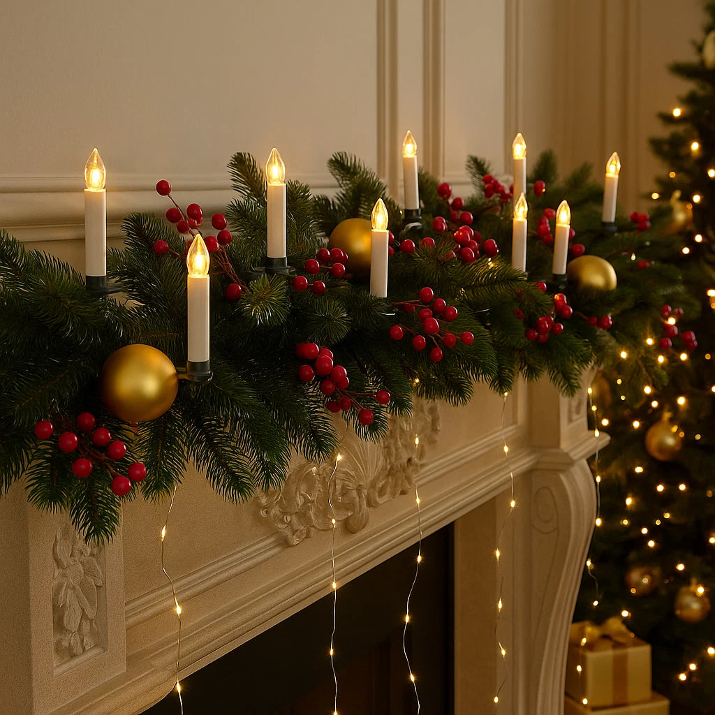 These 50 LED candle string lights add warmth and elegance to your Christmas tree or garland. Each flickering candle features a clip for easy attachment to branches, with a green wire that blends seamlessly into your decor. The 5m mains-powered cable includes an auto timer function for convenient operation. Perfect for creating a cosy, traditional festive atmosphere.