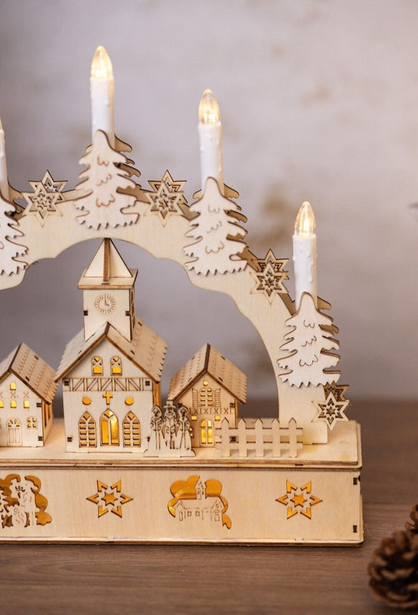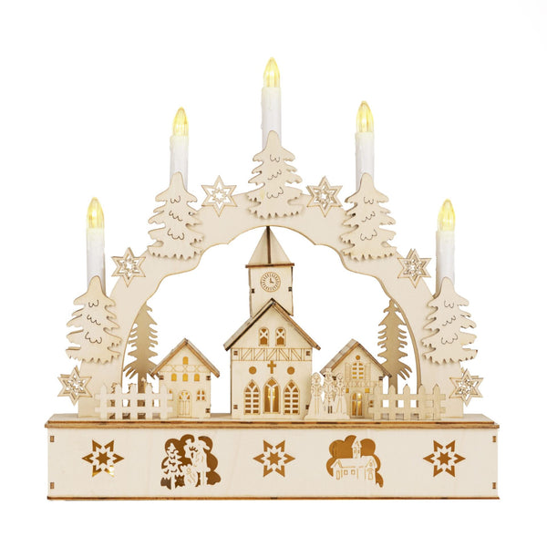 With stunningly intricate trees on every LED Candle spread across the arch of this village scene, this ornamental piece casts beautiful silhouettes when illuminated!