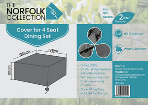 The Cover Bellmount 4 Seater Dining - This outdoor furniture cover offers reliable protection with its UV 50+ rating, helping to prevent sun damage and extend the life of your furnishings. Its water-resistant design effectively shields against rain and moisture, keeping furniture dry and well-maintained. Crafted from durable Oxford 300D fabric, it includes a strong rope to secure the cover during windy weather. For added convenience, a zipped carry bag is included, making storage and transport easy while keeping the cover clean and ready for use.