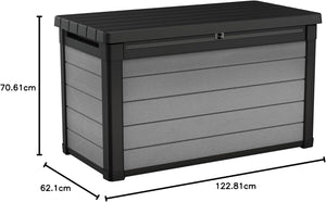 Made from strong Duotech resin, this box is UV protected and water resistant making it the perfect space for storing your outdoor seat pads, hot tub accessories, or children's toys. With the addition of your own padlock, it is also lockable, ensuring that extra layer of security and peace of mind that all your items are being kept safe and sound. What's more, thanks to the piston hinges incorporated, you'll be able to access what you need with ease and efficiency. This Keter storage box is finished in a UV protected two-tone textured wood effect, for a fade free, contemporary aesthetic.