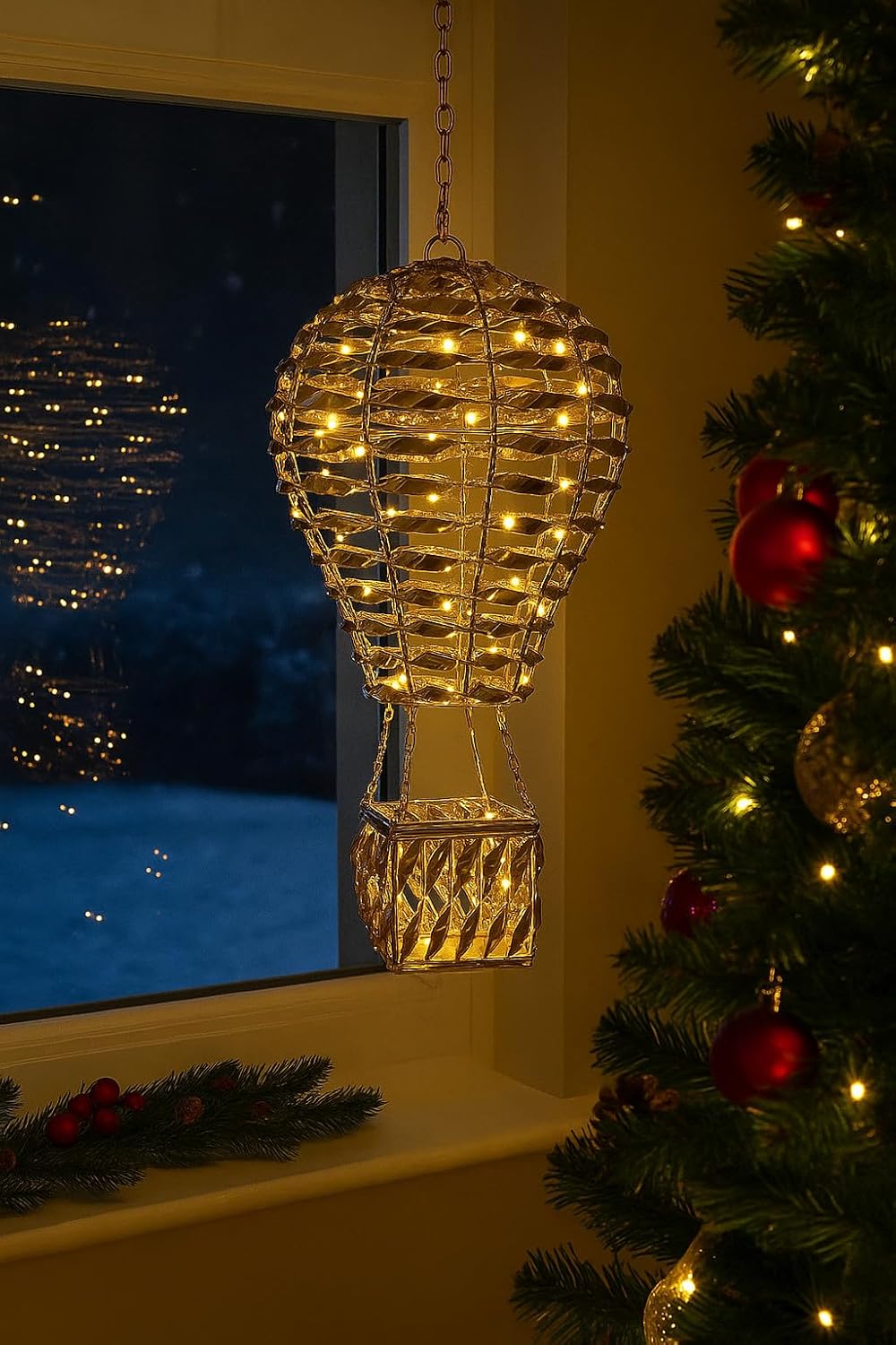 Bring festive magic to your home with this enchanting gold hanging hot air balloon Christmas light. Perfect for creating a whimsical holiday atmosphere, this charming decoration combines timeless elegance with playful seasonal spirit. The warm golden finish catches the light beautifully, casting a gentle glow that transforms any room or outdoor space. Ideal for tree displays, window arrangements, or as a standalone focal point, this unique ornament adds personality and warmth to your festive decor.