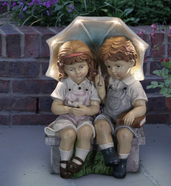 Garden Ornament - This girl and boy figurine garden ornament is designed with care and attention to detail, the realistic life like details bring our garden ornament to life. The adorable children are sitting on a bench underneath an illuminated umbrella.