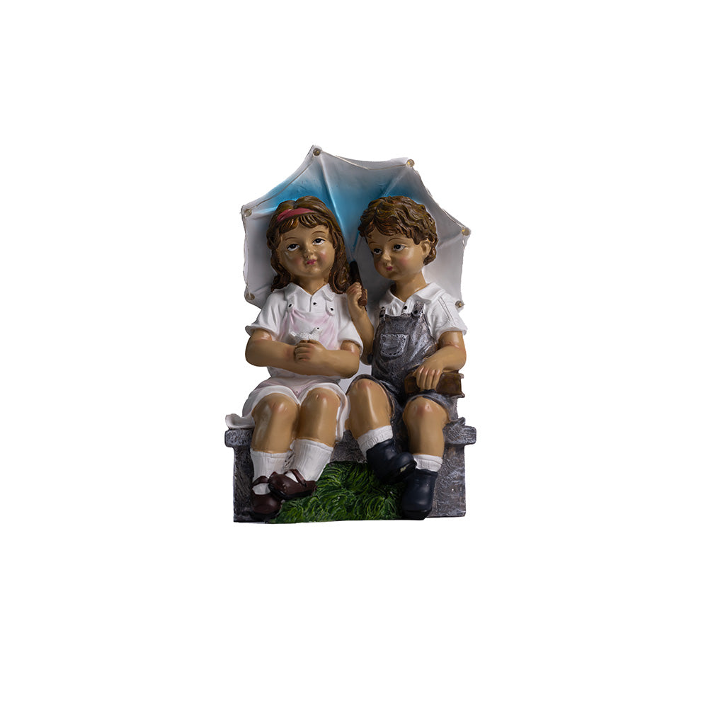 Garden Ornament - This girl and boy figurine garden ornament is designed with care and attention to detail, the realistic life like details bring our garden ornament to life. The adorable children are sitting on a bench underneath an illuminated umbrella.