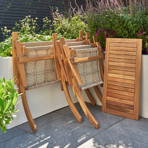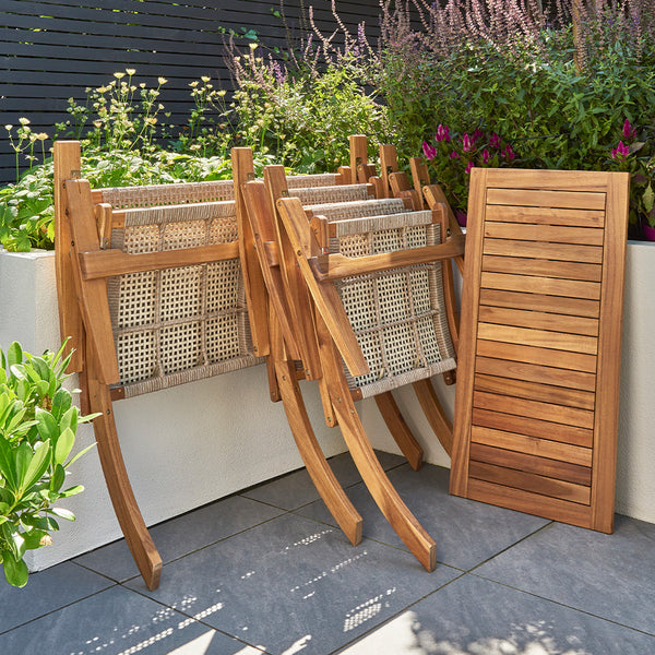 This Walden Folding Lounge Set comes with 2 chairs, bench and a table, so it's perfect for families to spend time together enjoying a barbecue in the garden. Ideal for those who are environmentally conscious as well as stylish, the frame is made from a natural Acacia/resin weave which is approved, meaning the material is only sourced from well managed forests that are following the highest standards. Highly practical, once the glorious weather ends and seasons change, you can fold up this set and pop it away for safe storage, it's super-easy.