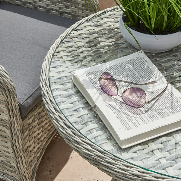 The Wroxham Deluxe 2 Seater Bistro Set seamlessly blends classic hand woven wide grey weave with a modern touch, featuring a slate grey ceramic/glass top and comfortable grey cushions. The Wroxham Chair provides an extra level of comfort with its generous depth and high back. It's the perfect choice for those who appreciate traditional aesthetics with a contemporary twist.